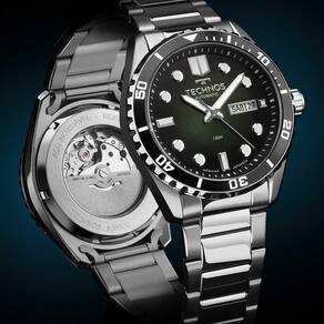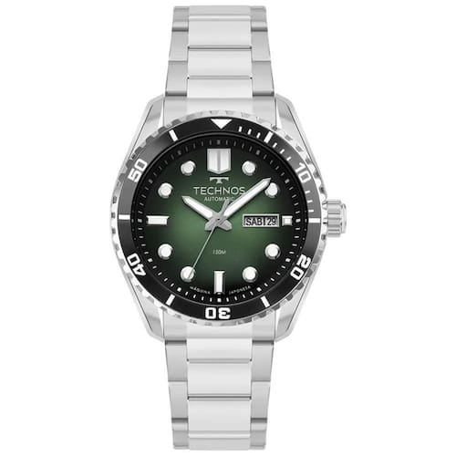 Mecanismo: Automático - Miyota com 21 Jewels - Reserva de marcha de 42h. Gênero: Masculino Visor: Verde e preto degrade Vidro: Safira Funções: calendário day-date, case back transparente, aro giratório unidirecional, Prova d'água: 150m Características: com caixa e pulseira em aço inoxidável Diâmetro da caixa: 43 mm Garantia: 1 ano pelo fabricante Technos