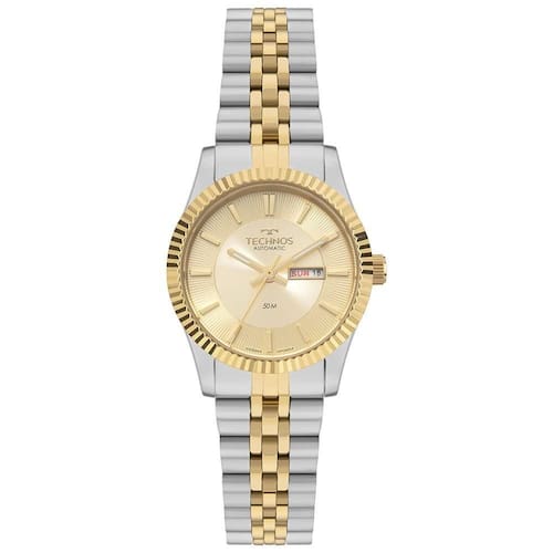 Relógio Technos Feminino Automatico Bicolor - 6t51ab/1x A linha Technos Automático Day-Date apresenta novos modelos femininos que unem tradição e sofisticação em um design clássico. Com maquinismo automático japonês, calibre 6T51, corda manual e por movimentação, reserva de marcha de 40 horas e 21 jewels, é uma coleção que traduz a precisão relojoeira com elegância. O fundo rosqueado de vidro revela o movimento interno, enquanto o aro externo com acabamento corrugado e o mostrador texturizado reforçam o acabamento refinado. Com o toque do calendário day-date e pulseira em aço inoxidável 5 links, a coleção apresenta resistência à água de 50 metros. Além disso, possui caixa de 30mm, mostrador dourado e banho bicolor dourado/prata. Cor da Caixa - Prata Banho - Bicolor Tipo - Automático Material da Pulseira - Aço Material da Caixa - Aço Formato - Redondo Cor do Mostrador - Champagne Garantia - 12 meses Cor da Pulseira - Bicolor Largura da Caixa (cm) - 3,0 Resistência à Água - 5 ATM Cor - Bicolor Tamanho - Pequeno Gênero - Feminino