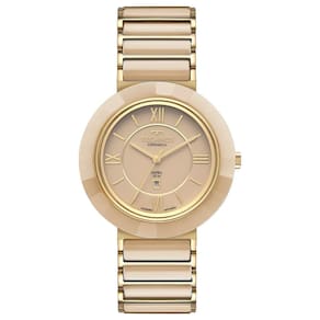 Relógio Ceramic apresenta um novo lançamento de design sofisticado, definido pela lente de safira e aplicação de cerâmica. Sua caixa redonda e seu mostrador na cor bege contam com assinatura de linha e numeração romana nos marcadores de hora, além do aro facetado de cerâmica. Sua pulseira é complementada por aço inoxidável e aço com cerâmica. Produto 100% em aço inoxidável, banhado em dourado, máquina quartz Japonesa Miyota e resistência à água de 50 metros.