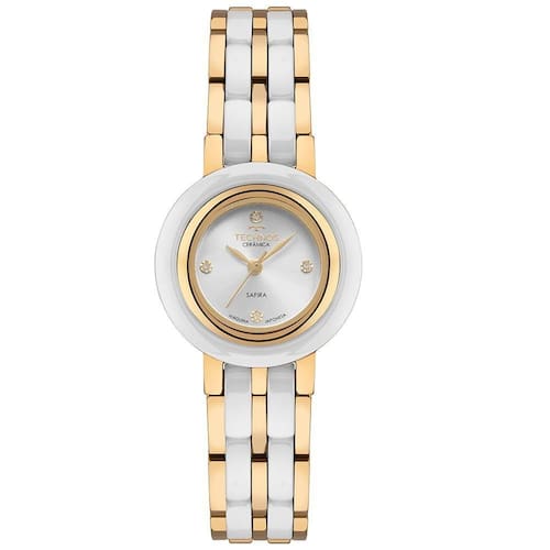 Relógio Technos Feminino Ceramic Sapphire Dourado - 5y36ad/1k A linha Technos Cerâmica apresenta modelo , que une delicadeza e sofisticação. Com caixas pequenas e diferenciadas, o relógio ganha um charme especial em um design refinado. A pulseira de aço inoxidável em elos sólidos 5 links com aplicação de cerâmica modernidade, enquanto a lente de safira garante durabilidade, com alta resistência a riscos e arranhões. O relógio conta com banho bicolor branco com dourado e tamanho de caixa de 26mm e resistência à água até 30 metros. Banho - Dourado Tipo - Analógico Cor da Caixa - Dourado Material da Pulseira - Aço Cerâmica Material da Caixa - Aço Cerâmica Formato - Redondo Cor do Mostrador - Prata Garantia - 12 meses Cor da Pulseira - Branco Largura da Caixa (cm) - 2,6 Resistência à Água - 3 ATM Cor - Dourado Tamanho - Pequeno Gênero - Feminino