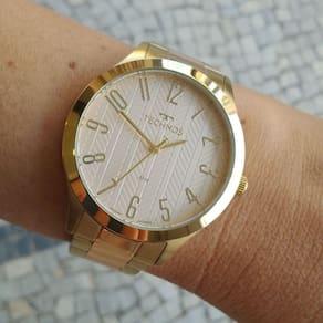 Relogio Technos feminino dourado rosa numeros 2036MSH/1J Relógio Technos Elegance Dress com design moderno. Seu mostrador de fácil leitura apresenta numeração arábica completa e aplicação de textura diferenciada. Produto 100% em aço inoxidável em banho bicolor, com máquina quartz japonesa Miyota e resistência à água de 50m. Tamanho de caixa 42mm.
