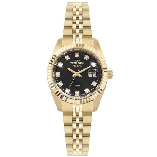 Relógio Technos Feminino Ref: 2015cel/1p Clássico Riviera Dourado Descrição do Produto: Caixa de Aço Inox Pulseira de Aço Inox Fundo de Pressão Resistente à Água 5 Atm Diâmetro / Largura da Caixa: 29.00 MM Vidro de Cristal Mineral Funções: Analógico, Calendário com Lupa Maquina Japonesa Alimentação do Maquinário: Bateria Mostrador Preto com Pedras