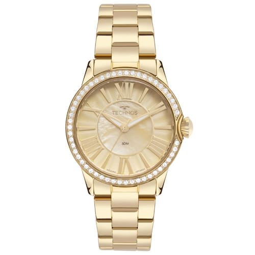 Relógio Technos Feminino Ref: 2035myv/1x St. Moritz Dourado Descrição do Produto: Caixa de Aço Inox Pulseira de Aço Inox Fundo de Pressão Resistente à Água 5 Atm Diâmetro / Largura da Caixa: 39.00 MM Vidro de Cristal Mineral Funções: Analógico Maquina Japonesa Alimentação do Maquinário: Bateria Mostrador Madreperola Champanhe com algarismos romanos