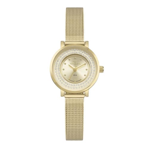 Relógio Technos Feminino Ref: 2035nad/1d Fashion Mesh Dourado Descrição do Produto: Caixa de Aço Inox Pulseira de Malha de Aço Mesh Fundo Resistente à Água 5 Atm Diâmetro / Largura da Caixa: 25.00 MM Vidro de Cristal Mineral Funções: Analógico Maquina Japonesa Alimentação do Maquinário: Bateria Mostrador Dourado Aro interno de pedras de 1 Ano Marca: Não Informado
