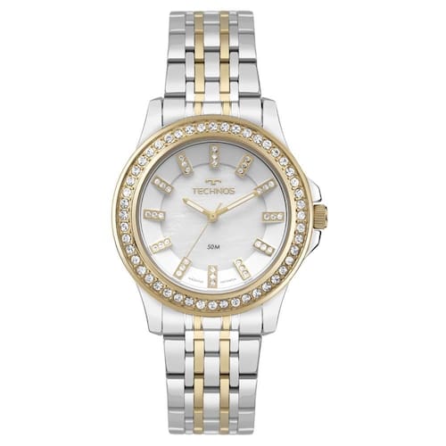 Relógio Technos Feminino Ref: 2035nav/1k St. Moritz Bicolor Descrição do Produto: Caixa de Aço Inox Pulseira de Aço Inox Fundo Rosqueado Resistente à Água 5 Atm Diâmetro / Largura da Caixa: 36.00 MM Vidro de Cristal Mineral Funções: Analógico Maquina Japonesa Alimentação do Maquinário: Bateria Mostrador Madreperola Branca com pedras Aro Externo com pedras Prateado com Dourado de 1 Ano Marca: Não Informado Ean: 7891530848414