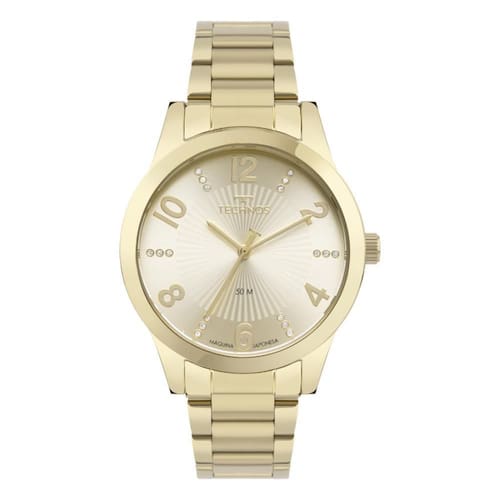 Relógio Technos Feminino Ref: 2035nay/1d Elegance Dourado Descrição do Produto: Caixa de Aço Inox Pulseira de Aço Inox Fundo Rosqueado Resistente à Água 5 Atm Diâmetro / Largura da Caixa: 38.00 MM Vidro de Cristal Mineral Funções: Analógico Maquina Japonesa Alimentação do Maquinário: Bateria Mostrador Dourado com números e pedras