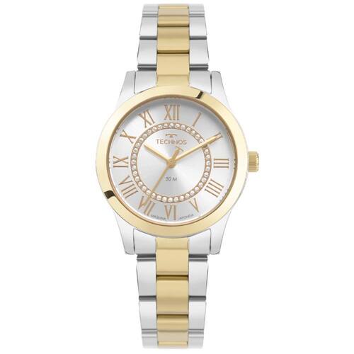 Relógio Technos Feminino Ref: 2036msx/1k Elegance Bicolor Descrição do Produto: Caixa de Aço Inox Pulseira de Aço Inox Fundo de Pressão Resistente à Água 5 Atm Diâmetro / Largura da Caixa: 32.00 MM Vidro de Cristal Mineral Funções: Analógico Maquina Japonesa Alimentação do Maquinário: Bateria Mostrador Prateado com algarismos romanos e pedras Prateado com Dourado