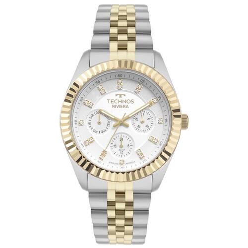 Relógio Technos Feminino Ref: 6p79cc/1k Riviera Multifunção Bicolor Descrição do Produto: Caixa de Aço Inox Pulseira de Aço Inox Fundo Resistente à Água 5 Atm Diâmetro / Largura da Caixa: 38.00 MM Vidro de Cristal Mineral Funções: Analógico, Multifunção Maquina Japonesa Alimentação do Maquinário: Bateria Mostrador Prateado com pedras Linha: Technos Riviera Prateado com Dourado de 1 Ano Marca: Não Informado