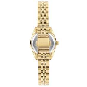 Relógio Technos Riviera feminino com caixa e pulseira de aço em banho dourado. Enaltecendo a essência dos clássicos, o modelo possui o icônico aro externo corrugado e vidro com lupa de calendário, ambos elementos tradicionais do universo relojoeiro. Além da pulseira diferenciada 5 links, ele apresenta mostrador de cor champanhe, que conta com a aplicação de pedras nos marcadores de hora. Produto 100% em aço inoxidável, com máquina quartz japonesa, calendário e resistência à água de 50m.