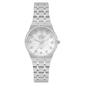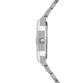 Seu mostrador em madrepérola confere um visual único e sofisticado, com variações sutis de brilho que tornam cada peça especial. Os marcadores de hora com aplicação de pedras reforçam essa proposta elegante, enquanto o aro também cravejado adiciona ainda mais presença e requinte ao modelo.