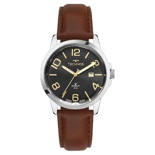Mecanismo: Máquina Quartz Gênero: Masculino Visor: Preto Vidro: Cristal mineral Funções: Calendário Prova d'água: 50m Características: Com caixa em aço inoxidável e pulseira em couro marrom Diâmetro da caixa: 42 mm Garantia: 1 ano pelo fabricante Technos