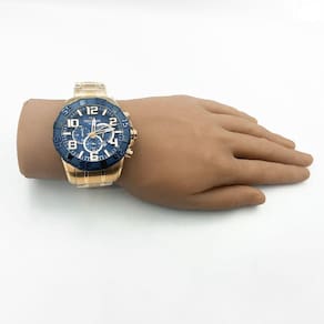 Características Formato do Relógio: Redondo Composição do Vidro: Cristal mineral Material da Caixa: Aço Inox Cor da Caixa: Azul, Dourado Cor do mostrador: Azul Material da Pulseira: Aço Inox Cor da Pulseira: Dourado Mecanismo: Analógico Multifunção