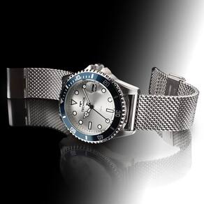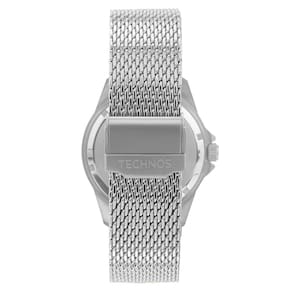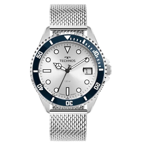 Relógio Technos Acqua apresenta elementos indispensáveis para aventuras submersas, como o aro externo giratório com acabamento corrugado e lente antireflexo com lupa de calendário, além do mostrador na cor prata com ponteiros e marcadores de hora luminescentes, que ainda conta com formas geométricas nos marcadores de hora. Produto 100% em aço inoxidável, com pulseira de aço inoxidável em mesh, banhado em prata, com máquina quartz japonesa Miyota, calendário e resistência à água de até 150 metros.