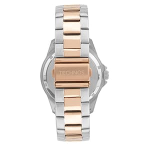 O Technos Acqua 2415EA/1A é um relógio masculino de mergulho com visual esportivo e sofisticado. Ele apresenta caixa de 45 mm, bezel preto giratório e mostrador escuro com detalhes em rosé, além de pulseira bicolor (prata e rosé), criando um contraste elegante e moderno.