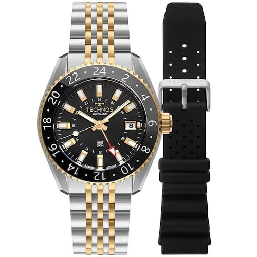Relógio Technos Masculino Automatico Gmt Bicolor - Nh34ac/t1p Relógio Technos Masculino Automatico Bicolor - Nh34ac/t1p O Technos Automático GMT é uma edição especial limitada que celebra a trajetória global da Technos, com origens suíças, passagem pelo Japão e consolidação no . Inspirado em um legado que travessou continentes, o modelo traz a presença imponente do quarto ponteiro, que permite a leitura simultânea de até três fusos horários. Ele é movido pela precisão do maquinismo automático japonês GMT, com 24 jewels e reserva de marcha de 41 horas. O aro externo giratório bidirecional, com aplicação de cerâmica e acabamento corrugado, possibilita alterar fusos com apenas uma rotação, enquanto a clássica lente de safira protege o mostrador de riscos e arranhões. Seu mostrador, rico em detalhes, apresenta ponteiros e marcadores de hora luminescentes, que garantem excelente legibilidade em qualquer ambiente. O fundo de vidro rosqueado revela a sofisticação do movimento mecânico, reforçando o prestígio da peça. Com caixa de 43mm e resistência à água de até 200 metros, o modelo ainda oferece versatilidade e conforto com o sistema troca-pulseira, acompanhando uma sólida pulseira em aço inoxidável de 7 links e uma pulseira extra em silicone perfurado. Feito 100% em aço inoxidável e configurado com coroa rosqueada e dupla vedação em anéis de borracha, o relógio assegura a máxima impermeabilização. Para marcar a exclusividade desta edição, o modelo acompanha estojo especial e ferramenta para a troca das pulseiras. Banho - Bicolor Tipo - Automático Cor da Caixa - Bicolor Material da Pulseira - Aço Material da Caixa - Aço Formato - Redondo Cor do Mostrador - Preto Garantia - 12 meses Cor da Pulseira - Bicolor Largura da Caixa (cm) - 4,3 Resistência à Água - 20 ATM Cor - Bicolor Tamanho - Médio Gênero - Masculino