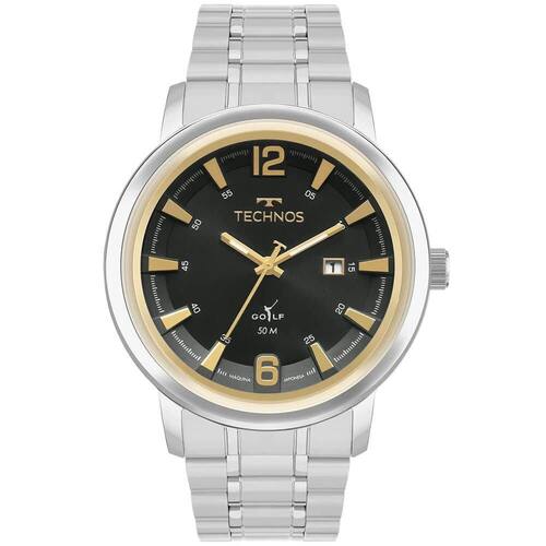 Relógio Technos Golf com caixa e pulseira de aço. Com seu design moderno e sofisticado, ele apresenta mostrador na cor preta, vidro abaulado com detalhe metálico e assinatura da linha no mostrador. Produto 100% em aço inoxidável, com máquina quartz japonesa, calendário e resistência à água de 50m.