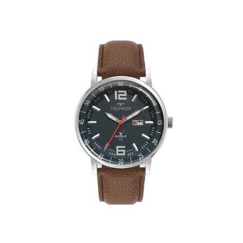 Relógio Masculino TECHNOS Classic Golf Referência TECHNOS do Brasil 2115TVP/0A Máquina japonesa movida a bateria / quartz Mecanismo Analógico com 3 ponteiros Caixa do relógio em aço inoxidável prateado Pulseira de couro marrom Fivela de aço inox Mostrador azul / azul petróleo Vidro de Cristal Mineral Relógio com calendário dia do mês Coroa simples de pressão padrão sem rosca Tampa posterior rosqueada Resistência à água 5ATM 50M