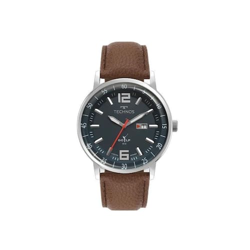 Relógio Masculino TECHNOS Classic Golf Referência TECHNOS do Brasil 2115TVP/0A Máquina japonesa movida a bateria / quartz Mecanismo Analógico com 3 ponteiros Caixa do relógio em aço inoxidável prateado Pulseira de couro marrom Fivela de aço inox Mostrador azul / azul petróleo Vidro de Cristal Mineral Relógio com calendário dia do mês Coroa simples padrão sem rosca Tampa posterior rosqueada Resistência à água 5ATM 50M