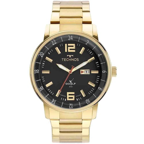 Relógio Technos Golf masculino. Caixa de aço inoxidável tamanho 4,6cm. Banho dourado com pulseira em aço polido e escovado. Maquinismo analógico com data no mostrador e assinatura da linha Golf. Resistência à água em até 50 metros.