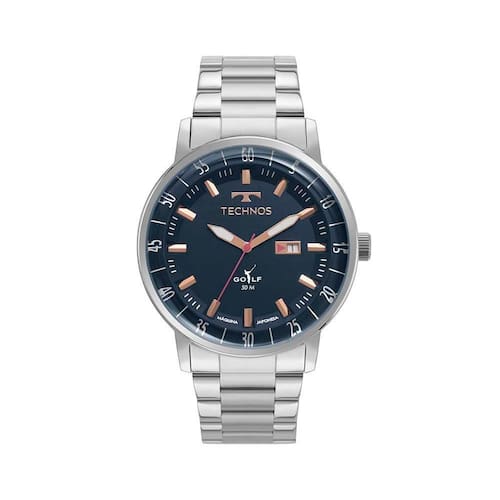 Sua caixa robusta de 46mm em aço inox prateado abriga um mostrador azul profundo, com ponteiros e marcadores em tom rosé, criando um contraste elegante e sofisticado. O destaque fica por conta do ponteiro de segundos vermelho e do logotipo GOLF que reforça o conceito esportivo da peça. Além disso, o modelo possui calendário na posição das 3h, agregando praticidade ao estilo.