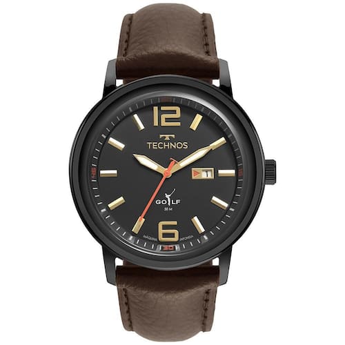 Linha: Classic Golf Garantia: 12 meses em toda rede autorizada Technos Conteúdo da embalagem: 1 relógio, manual, certificado de garantia Fornecedor: Technos Indústria e Comércio da Amazônia S/A Características: Vidro: Cristal Mineral Material da caixa: Aço Cor da caixa: Preto Material da pulseira: Couro Cor da pulseira: marrom Diâmetro da caixa: 4,6 cm Mecanismo: Quartz / Máquina Japonesa Funções: Analógico / Calendário Resistência à água : 5 atm