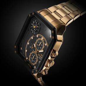 Com caixa quadrada de 45 mm em aço inoxidável dourado e aro preto, o modelo entrega um visual moderno e imponente. O mostrador preto texturizado exibe múltiplos submostradores funcionais, incluindo cronógrafo, marcador de 24 horas e segundos contínuos, além de calendário posicionado discretamente às 4 horas.