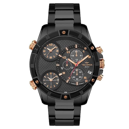 Relógio Technos Masculino Legacy Js153maqac/1p Preto Grafite Relógio TECHNOS Classic Legacy Modelo: JS153MAQAC/1P Categoria: Masculino Linha Classic Legacy Cronografo Tamanho: Grande Funções - Analógico - Calendário dia do mês - Horário 12/24 horas - Cronógrafo Características - Sistema de energia: Bateria - Coroa: Simples - Botões: Simples - Tampa posterior: Rosqueado - Resistência à água: 100 m - Vidro: Cristal - Mostrador Preto com detalhes cor Bronze - Material da caixa: Aço Inoxidável - Material da pulseira: Aço Inoxidável Medidas - Diâmetro da caixa: 5,8 cm - Diâmetro do visor: 4,3 cm - Espessura da caixa: 1,4 cm - Largura da pulseira: 2,6 cm Acompanha - Manual - Embalagem - de 1 ano Marca: Não Informado