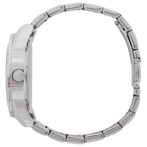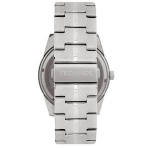 Relógio Technos masculino com caixa e pulseira de aço. Este modelo possui características esportivas. Com banho prata, o aro proeminente e o vinco nos elos centrais da pulseira são atributos fortes. O mostrador preto traz calendário e indexes em camadas tridimensionais. Modelo resistente a água até 50 metros.
