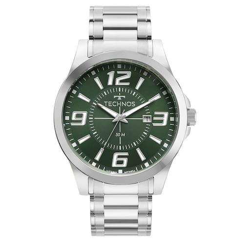 Relógio Technos Racer apresenta o diferencial do aro interno metalizado e mostrador colorido. Com sua estética esportiva, a linha Racer apresenta números grandes nos marcadores de hora e segundeiro da mesma cor do aro interno. Produto 100% em aço inoxidável, apresenta pulseira de aço inoxidável em 3 links, mostrador na cor verde, banho em prata, máquina quartz japonesa Miyota, calendário e resistência à água de 50 metros.