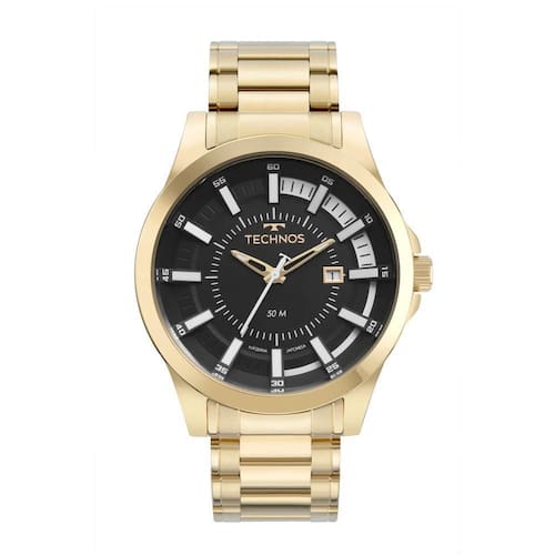 Relógio Technos Racer com mostrador de design esportivo, que apresenta efeito de profundidade e toques de cor. Produto 100% em aço inoxidável em banho dourado, com máquina quartz Japonesa Miyota e resistência