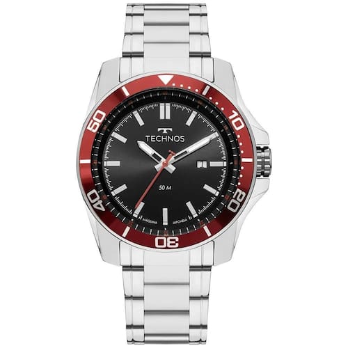 O Technos Racer Premium 2117LFV/1P é um relógio masculino imponente, esportivo e sofisticado. Seu design combina caixa prateada robusta com mostrador preto e aro vermelho metálico, criando um visual marcante, moderno e cheio de personalidade perfeito para quem gosta de acessórios com presença.