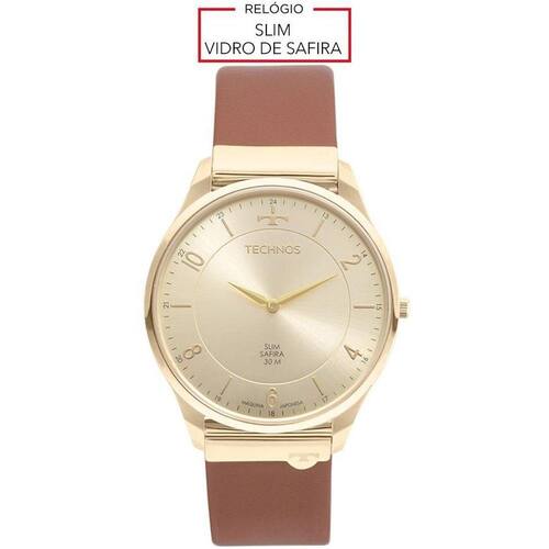 Relógio Technos slim unisex na cor dourada e tamanho de caixa 4,0 cm. Com pulseira de couro legítimo e vidro de safira, resistente a arranhões. Um modelo com uma combinação de cor clássica em uma caixa ultra fina com 5.00mm de espessura, ideal para quem procura um relógio mais discreto e diferenciado.