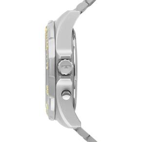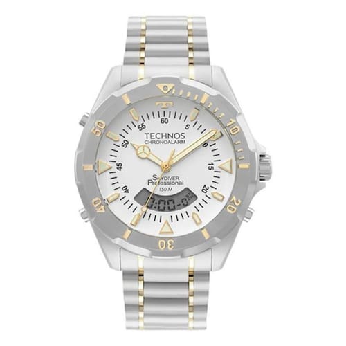Gênero: Masculino Banho: Bicolor Tipo: Ana Digi Cor da Caixa: Prata Material da Pulseira: Aço Formato: Redondo Tipo de Fecho: Trava de Segurança : 12 meses Cor da Pulseira: Bicolor Largura da Caixa cm : 4,4 Resistência à Água: 5 ATM Relógio Technos Skydiver apresenta seu novo lançamento, de maquinismo anadigi com novo módulo exclusivo com 4 baterias, oferecendo maior durabilidade ao relógio, e com aro giratório unidirecional. Além disso, ele apresenta mostrador de fácil leitura com marcadores de hora luminescentes, além de cronógrafo e aro corrugado. Produto 100% em aço inoxidável, com pulseira de aço inoxidável em 3 links, com resistência à água de 150 metros. Marca: Não Informado Ean: 7891530877544