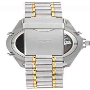 A caixa é feita em aço inox na cor prateada, o que confere um visual elegante e sofisticado ao relógio. Já a pulseira também é de aço inox, com acabamento bicolor, proporcionando um contraste moderno e estiloso.