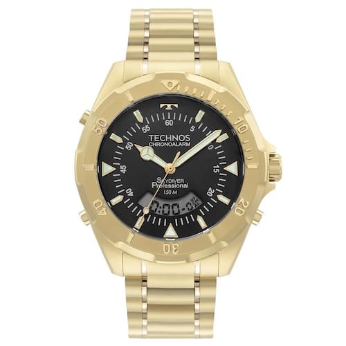 Com caixa de 44mm em aço inoxidável dourado e mostrador preto, o relógio combina o clássico ponteiro analógico com função digital, exibindo data, alarme, cronômetro e iluminação noturna. O aro giratório adiciona um toque esportivo e funcional, ideal para cronometragens rápidas.