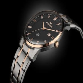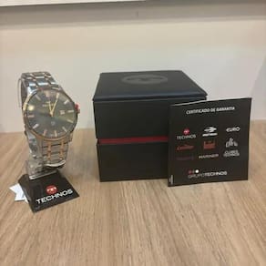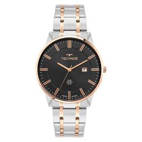 Relógio Technos Slim com caixa prata e aro rosé, de construção fina e sofisticada. Apresenta pulseira de aço em 5 links, mostrador com design minimalista e assinatura de linha; vidro de safira, resistente a riscos e arranhões. Produto em aço inoxidável, com máquina quartz japonesa Miyota, calendário e resistência à água de 50 metros. Pulseira em aço inoxidável bicolor prata e rosé. Marca: Não Informado