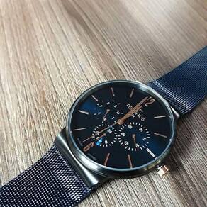 Esse relógio possui um mostrador azul, com formato redondo e vidro de cristal mineral, que oferece resistência e durabilidade. Seu mecanismo é analógico e funciona a bateria/quartz, garantindo precisão e confiabilidade.