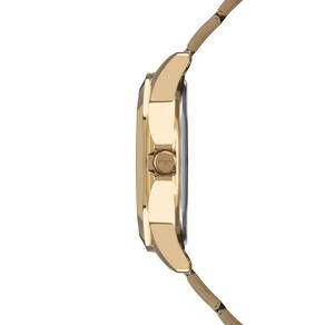 Com resistência à água de até 50 metros, o modelo é versátil e seguro em situações cotidianas, como lavar as mãos e enfrentar chuva leve. A pulseira de aço dourado, com fechamento por pressão, proporciona durabilidade, conforto e ajuste seguro.