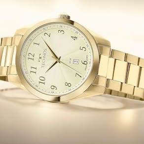 Relógio Technos Steel versátil e ideal para qualquer ocasião. Seu mostrador apresenta uma textura elegante e diferenciada, além da numeração arábica completa e marcação dos minutos/segundos no aro interno. Produto 100% em aço inoxidável em banho dourado, com máquina quartz japonesa Miyota, calendário e resistência à água de 50 metros. Tamanho de caixa 46mm.