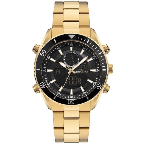 A caixa de 46 mm em banho dourado traz imponência e estilo, enquanto o mostrador preto exibe indicadores analógicos e digitais com excelente legibilidade. Seu aro rotativo esportivo reforça o caráter versátil do modelo, que conta com funções como cronômetro, alarme, calendário e luz noturna.