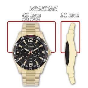 coleção racer cor dourado formato redondo tipo de tela analógico resistência 50 metros calendário sim material do vidro cristal mineral material da caixa aço material da pulseira aço tamanho da caixa 49 m espessura da caixa 1 mm tamanho da pulseira 25 cm peso 145 g acompanha estojo , garantia e.