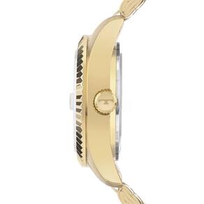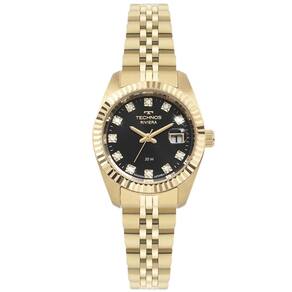 Relógio Technos Riviera feminino com a essência dos clássicos. Ele apresenta aro externo trabalhado com o icônico acabamento corrugado e vidro com lupa de calendário, ambos elementos tradicionais do universo relojoeiro. Além disso, possui mostrador com aplicação de pedras cravejadas nos marcadores de hora. Produto 100% em aço inoxidável em banho dourado, com diferenciada pulseira de 5 links, máquina quartz japonesa Miyota, calendário e resistência à água de 50m. Tamanho de caixa 28mm