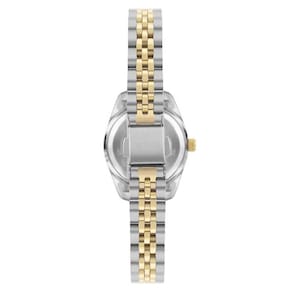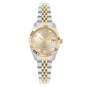 Relógio Technos Riviera feminino com caixa e pulseira de aço em banho bicolor prata com dourado. Enaltecendo a essência dos clássicos, o modelo possui o icônico aro externo corrugado e vidro com lupa de calendário, ambos elementos tradicionais do universo relojoeiro. Além da pulseira diferenciada 5 links, ele apresenta mostrador de cor champanhe, que conta com a aplicação de pedras nos marcadores de hora. Produto 100% em aço inoxidável, com máquina quartz japonesa, calendário e resistência à água de 50m.