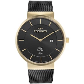Relógio technos slim masculino, com caixa de aço em banho dourado e pulseira de aço em banho preto. Modelo minimalista, que reinventa o conceito clássico da simplicidade através de acabamentos sofisticados, como o mostrador preto com efeito de profundidade. Produto 100% em aço inoxidável, com máquina quartz japonesa, calendário e resistência à água de 50m.Marca: TechnosUnissexCaixa: açoCor: DouradoPulseira: aço pretoMinimalistaMáquina quartz japonesa50ATM