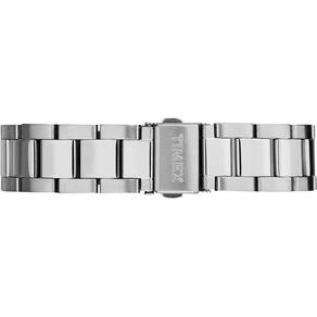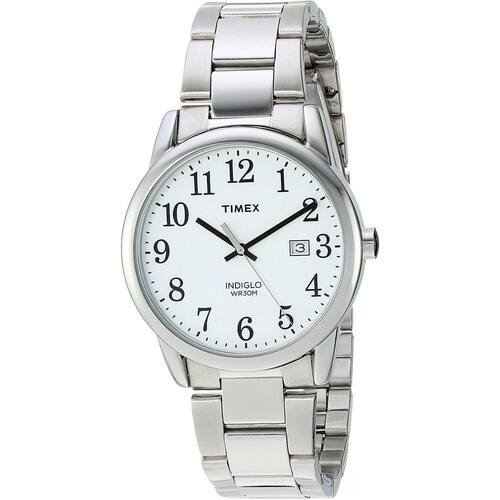 Pulseira de aço inoxidável de 20mm de tom prateado se encaixa até 8 polegadas de circunferência de pulso Discagem branca com janela de data às 3 horas; numerais arábicos completos Caixa de latão de 38mm com cristal de vidro mineral Indiglo luz-up discagem Água resistente a 30m (100 pés): em geral, suporta respingos ou breve imersão na água, mas não é adequado para nadar ou tomar banho