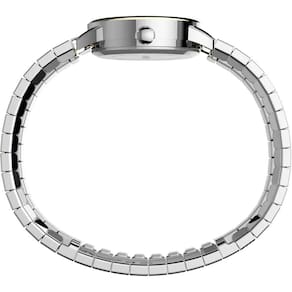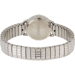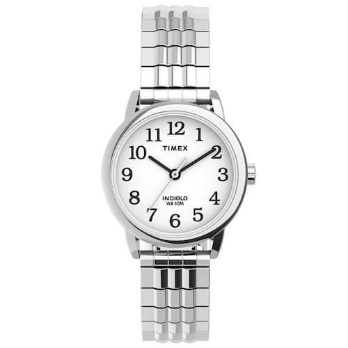 Funções: Analógico, Iluminação Indiglo Night Light Resistência à Água: 30m Diâmetro da Caixa: 25 mm Características: com caixa em Metal Prateado e pulseira em Aço Mola Prateado Vidro: cristal Mineral Fundo de Pressão Alimentação do maquinário: Bateria Mostrador Branco com todos os números em preto Linha: Timex Easy Reader