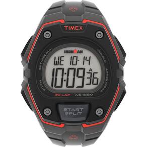 Timex Relógio masculino Ironman Classic 30 extragrande de 45 mm, Cinza escuro/preto/vermelho, Cronógrafo - Pulseira de resina preta ajustável de 20 mm para circunferência de pulso de até 20 cm - Cronógrafo de 100 horas com memória de 30 voltas; temporizador de contagem regressiva de 24 horas - 3 alarmes diários, dias da semana ou fim de semana; modo de horário militar 24 horas; 2 fusos horários; calendário de dia, data e mês - Caixa de resina cinza escuro e preto de 43 mm com lente acrílica; detalhes em vermelho; mostrador digital cinza; mostrador do relógio Indiglo que acende - Resistente à água até 100 m: em geral, adequado para natação e snorkeling, mas não para mergulho