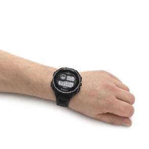 Projetado em caixa de plástico redonda de 50 mm e uma pulseira de plástico preta com uma fivela tradicional.