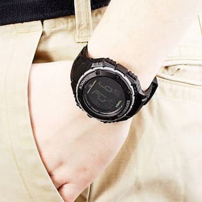 Funções: Digital, Iluminação (Indiglo Night Light), 3 Fusos Horários, Calendário, Cronógrafo de 100 Horas com memória para 30 voltas, 3 Alarmes (Com função vibratória), Timer, Sinal Horário Opcional, Lembretes, Timer de Hidratação