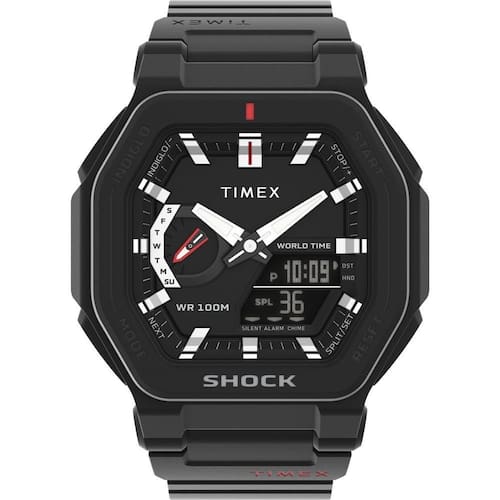 Relógio Timex Masculino Ref: Tw2v35600m Shock Anadigi Black DESCRIÇÃO DO PRODUTO: Funções: Anadigi, Iluminação Indiglo Night Light , Calendário, GMT Hora Mundial , Cronógrafo, Alarme, Timer Resistência à Água: 100m Diâmetro da Caixa: 45 mm x 38 mm Características: com caixa em Resina Preta e pulseira em Poliuretano Preta Vidro: acrílico Fundo Parafusado Alimentação do maquinário: Bateria Resistência a Choques Mecânicos Linha: Timex Command Mostrador Preto com detalhes em vermelho de 1 Ano Marca: Não Informado